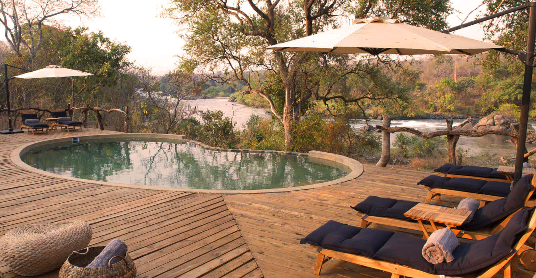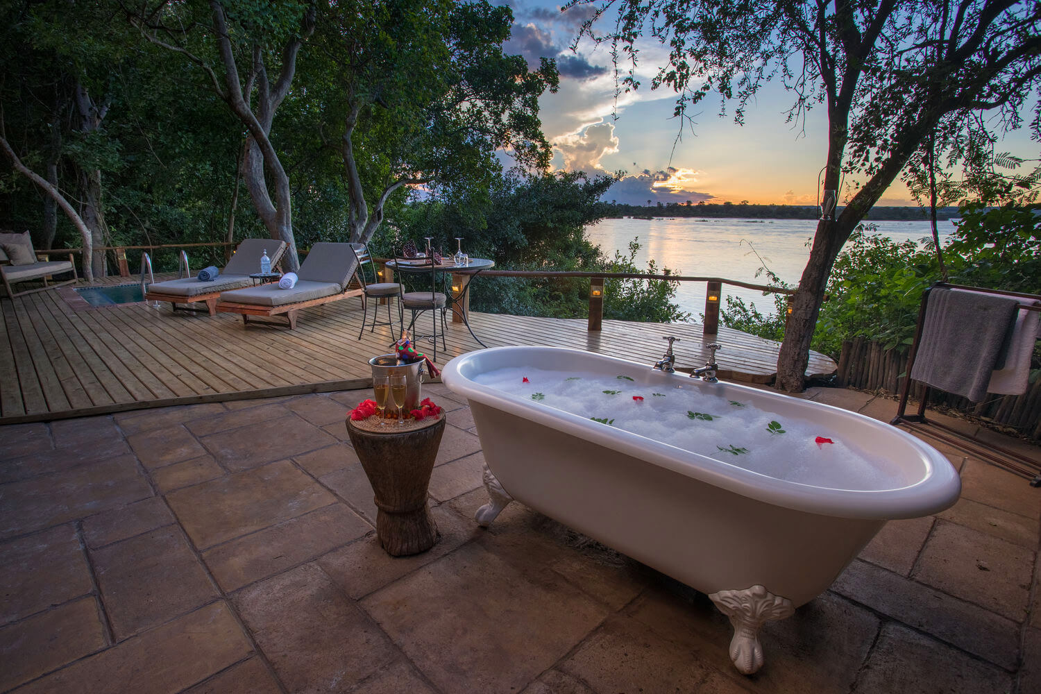 Veranda med upptrappat badkar på en av sviterna på Tongabezi Lodge med Zambezifloden nedanför | Foto: Tongabezi Lodge