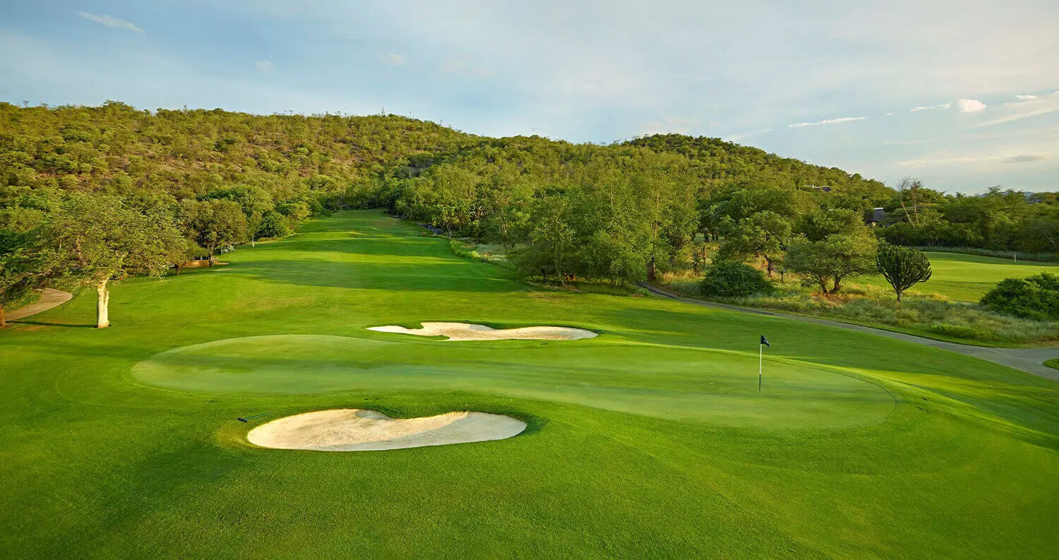 En Jack Nicklaus-designad bana som kombinerar links-stil med sydafrikansk terräng, känd för sin skönhet och utmaning.