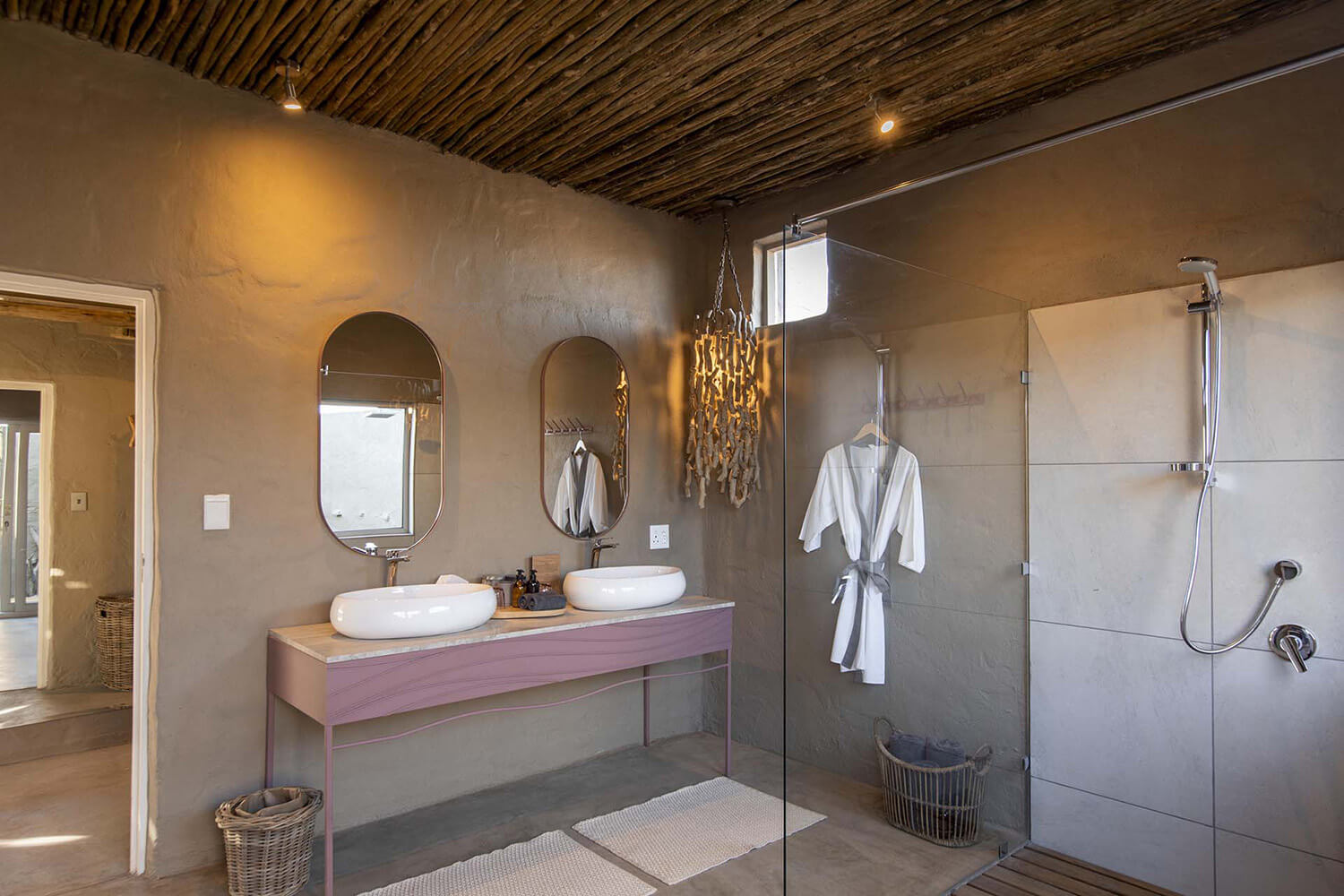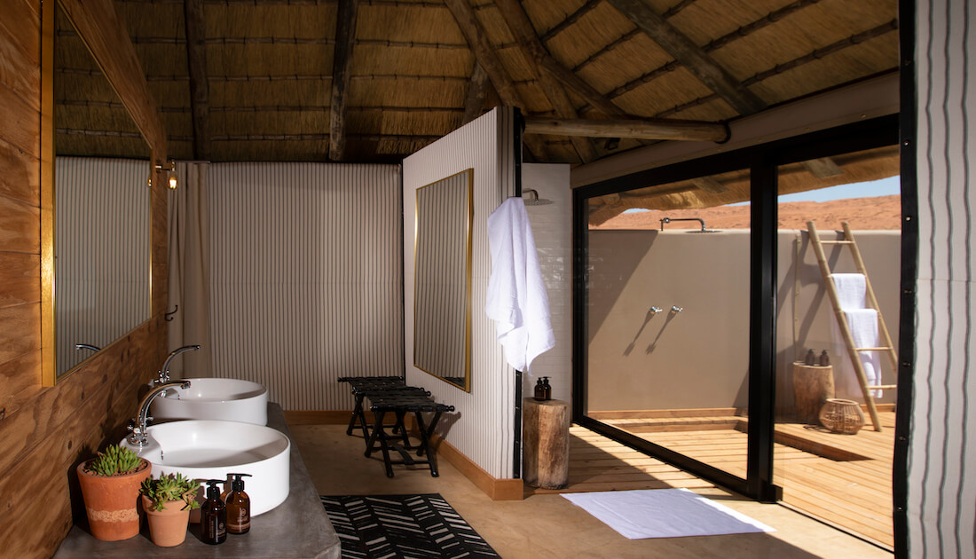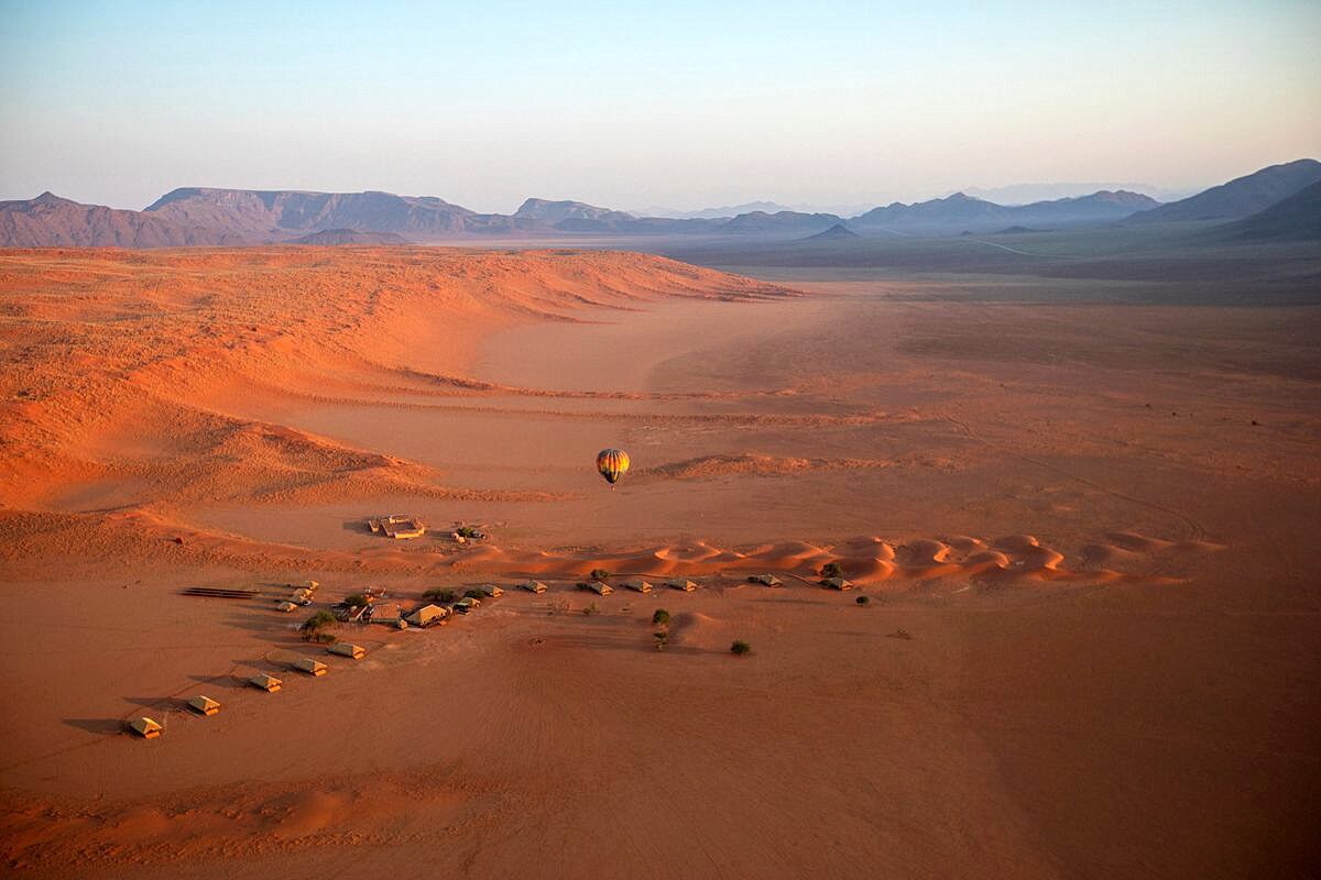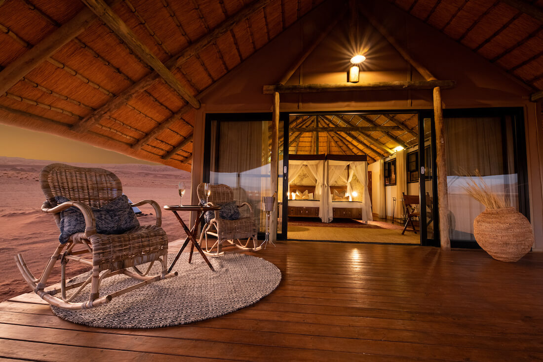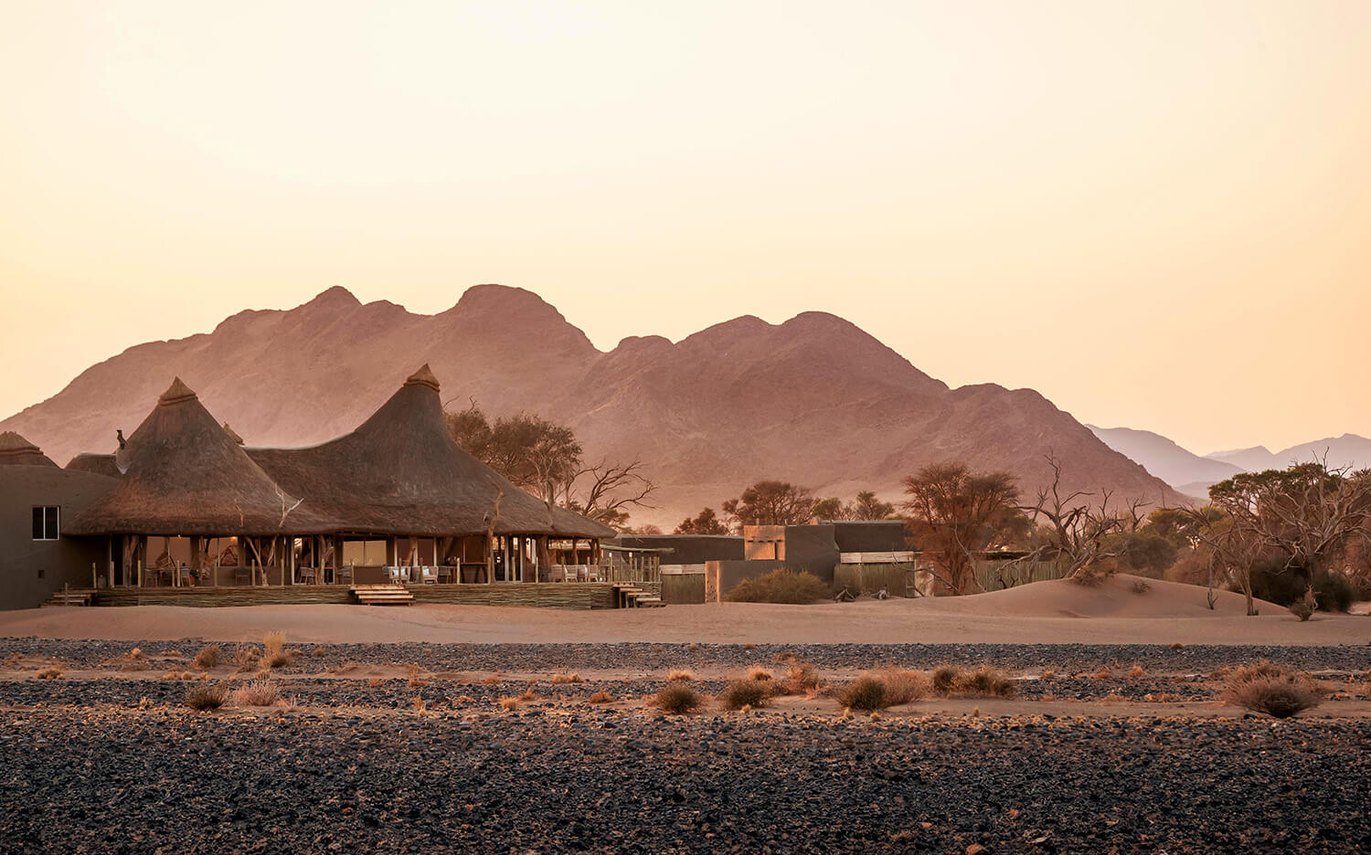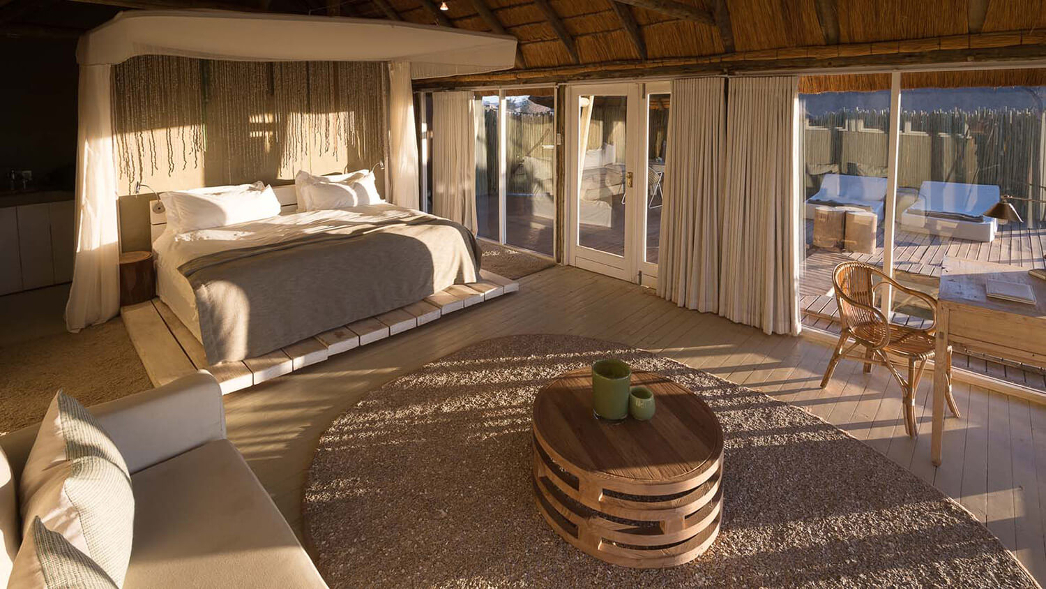 Flotta &Beyond Sossusvlei Desert Lodge ligger på en bergssluttning överblickandes en ändlös horisont med inslag av bergstoppar. Denna fridfulla oas av elegans är genomtänkt in i minsta detalj. De mycket stilrena villorna på 130 km² är byggda i sten och inredningen går i jordnära nyanser. Den stora sängen är begåvad med ett glastak som nattetid uppvisar det mest spektakulära himlaspel du sett. Varje villa är utrustad med egen bar, eldstad, Bose musikanläggning, luftkonditionering och takfläkt. Badrummet har dessutom både inomhus- liksom utomhusdusch. Utsikten är magisk genom den gigantiska panorama-glasväggen som vetter ut mot din veranda med soffor, eldstad, tubkikare och egen pool. Lodgens fashionabla loungeområde är en blandning av estetik, lyx och fridfullhet. Den stora poolen fylls på av en underjordisk källa, och när det börjar vattnas i munnen serveras den välsmakande middagen på det öppna trädäcket eller ute bland sanddynerna. Lagom till kvällning står en astronom och lodgens toppmoderna observatorium till förfogande.
