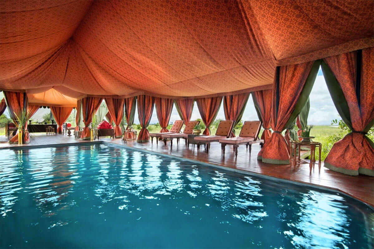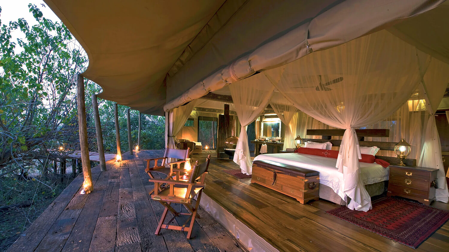 Legendariska Jack’s Camp ligger likt en oas, mitt i den heta Kalahariöknen. Campen är unik och byggd i beduinstil anno 1940. Sittandes på kuddar av persisk vävkonst under vackert draperade tyger gör att man känner sig som man är med i Tusen och natt. De nio eleganta och enorma tältsviterna på 132 km² styck, har högt i tak, rymliga vardagsrum, spatiösa sovrum med dubbla king size-sängar och stora badrum med inne- och utedusch. Inredningen går i estetiskt sammetsrött. Utanför finner du ett flott trädäck med pool och divaner för lata stunder—allt med utsikt mot öknen eller savannen (beroende på årstid). De gemensamma utrymmena under det höga tygtaket är spektakulära. De utsökta måltiderna serveras på antingen ett imponerande långbord, på persiska mattor på golvet eller runt lägerelden. Här finns en pool för svalkande dopp och ett biljardbord, allt under samma härliga tälttak. Dessutom finns även ett arkeologiskt museum för den historieintresserade. Safarin är unik då både gnuernas och zebrornas migration går förbi här (endast under regnperioden). Förutom safari med jeep erbjuder Jack’s Camp vandringssafari och fyrhjulingssafari (endast torra säsongen).